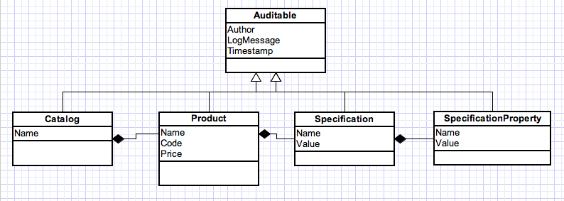 It’s hard. I don’t readily see a great solution. However, workarounds are there. For example, we can change the Audiable class to hold references to all levels of the Catalog object hierarchy. So, in that case the Auditables table will look like the following: